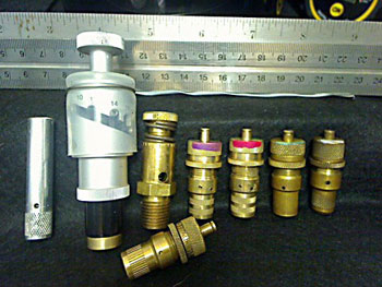 I next individually examined each deflator on our standard trade show tire deflator demonstration fixture. I’d inflate the simulated tire to 30-something psi, screw a deflator on the standard valve stem just as I would a tire, observe and listen for how it turned ON and then, how it shut OFF.